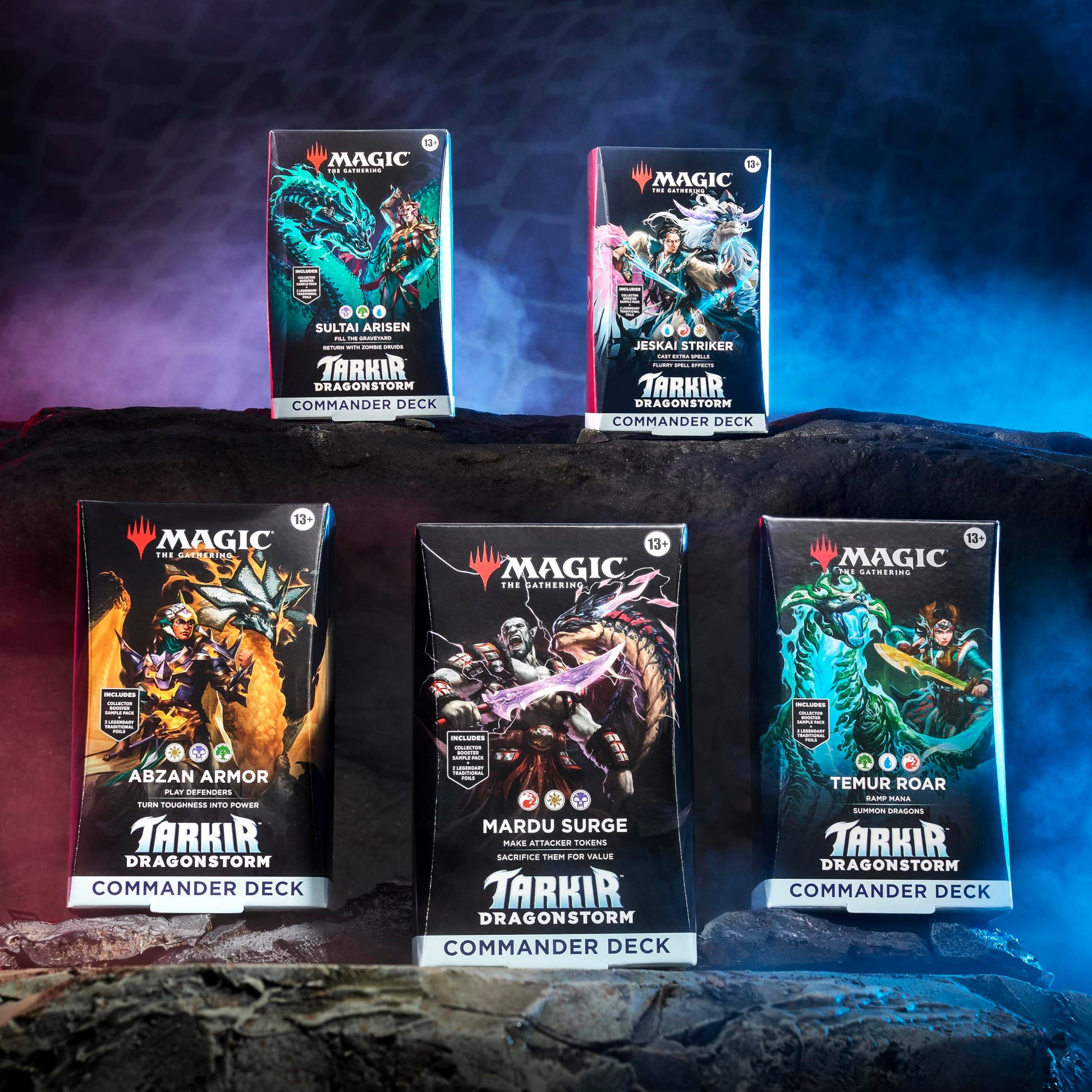 - GET ALL 5 TARKIR: DRAGONSTORM COMMANDER DECKS—This bundle includes all 5 decks, with 1 Abzan Armor (White-Black-Green), 1 Jeskai Striker (Blue-Red-White), 1 Sultai Arisen (Black-Green-Blue), 1 Mardu Surge (Red-White-Black), and 1 Temur Roar (Green-Blue-Red)
